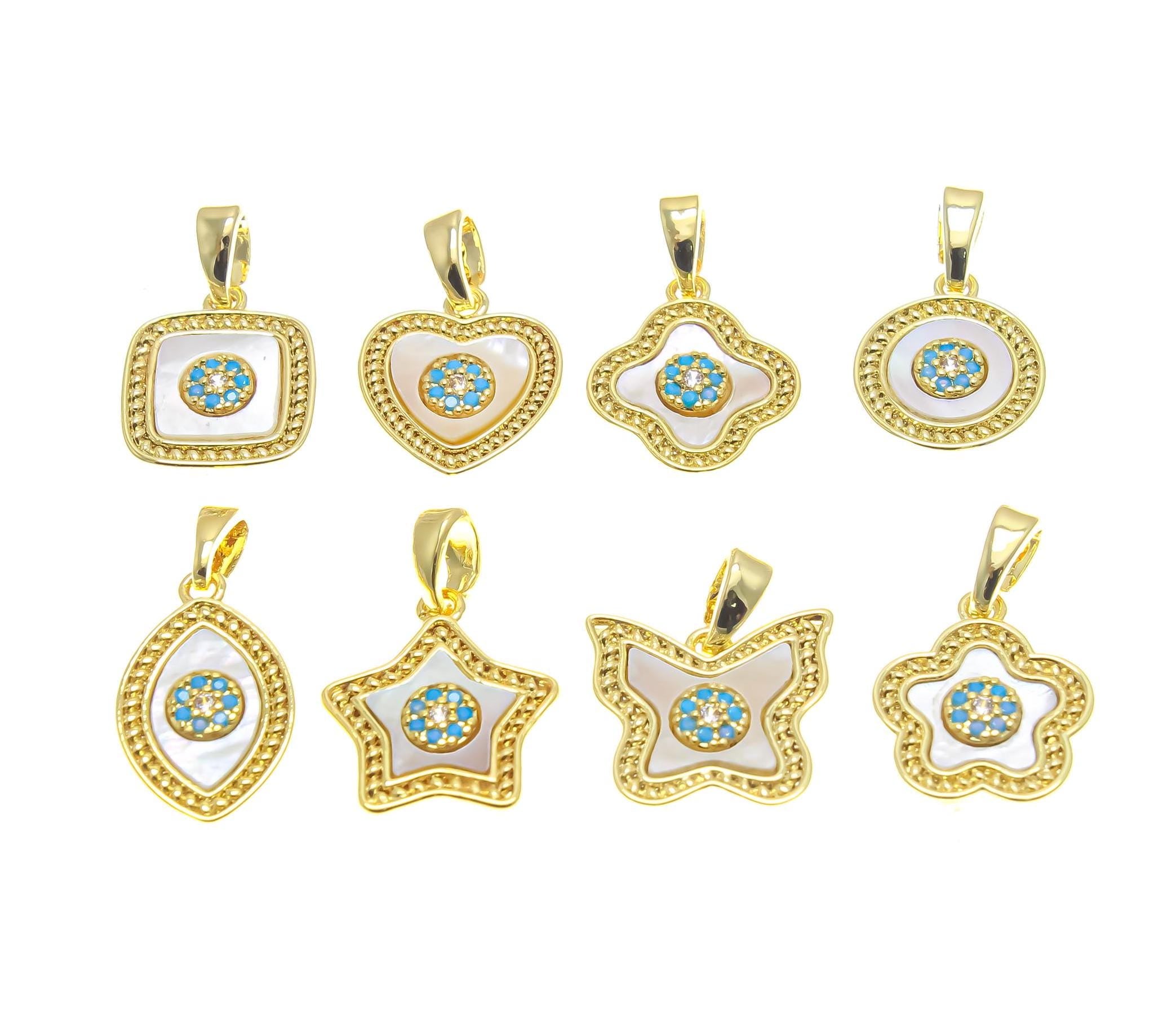 18k Gold Mother of Pearl Inlay Charm, Gold Inlay MOP Geometric Charm, CZ Pave Turquoise Detail Charm, For Jewelry Making, CPG2270-77