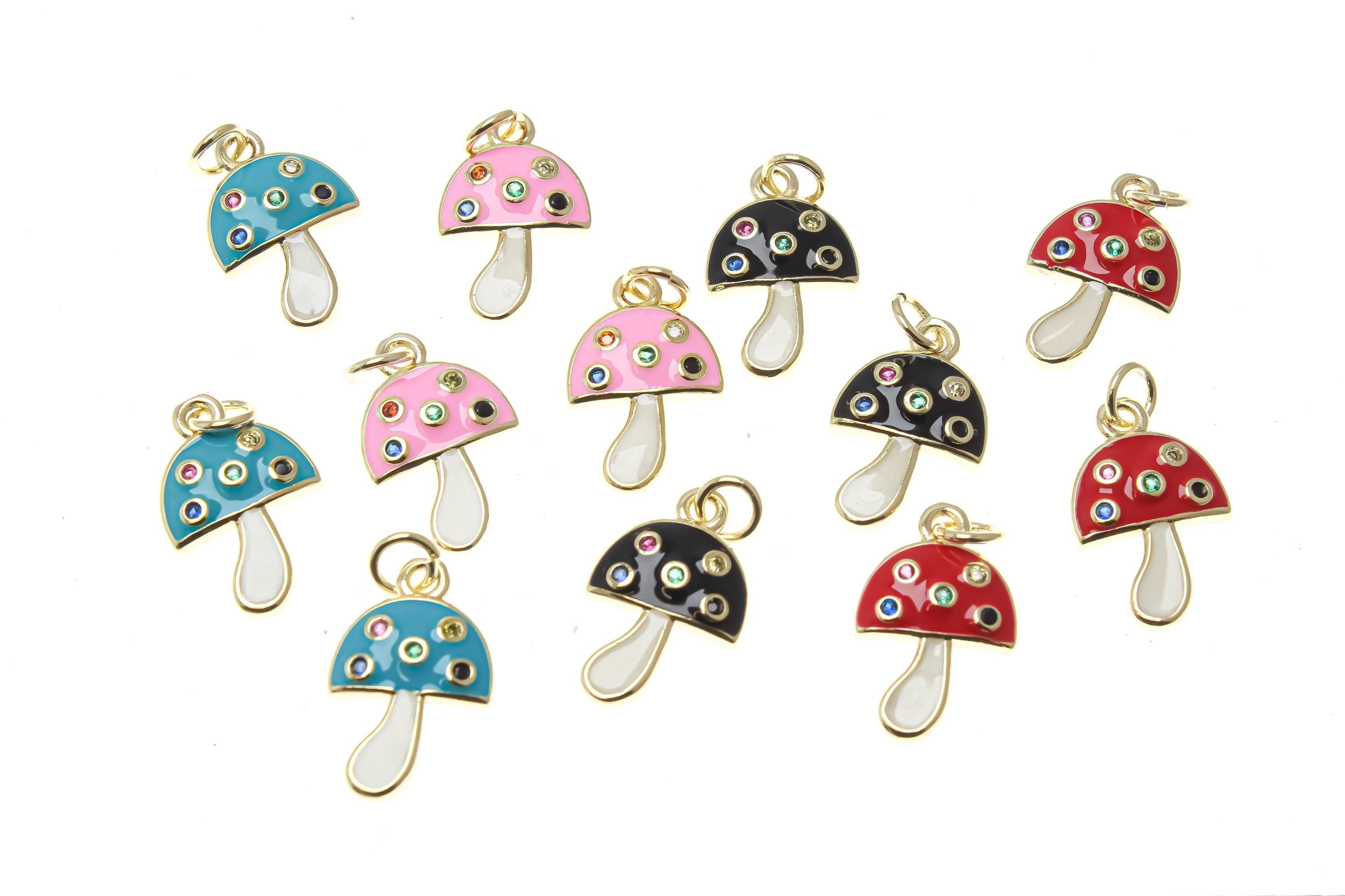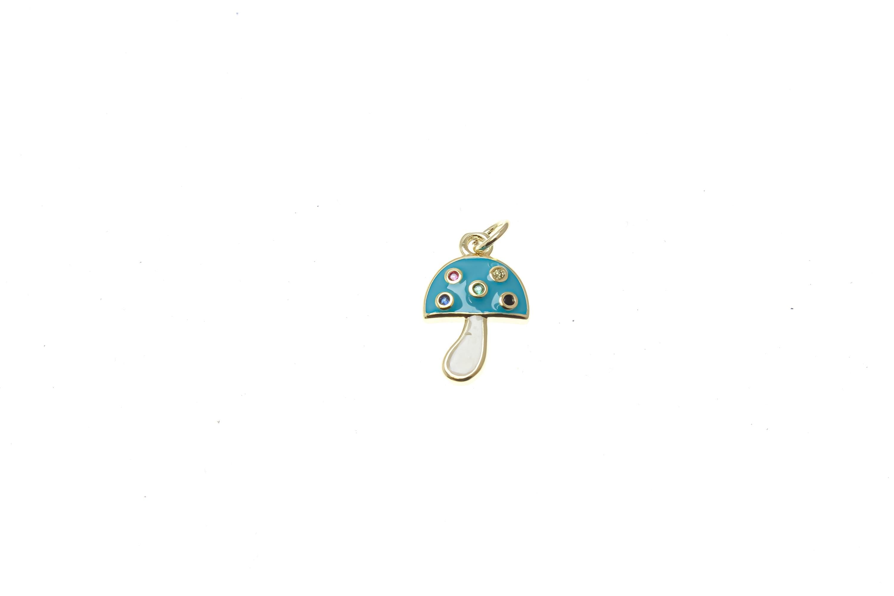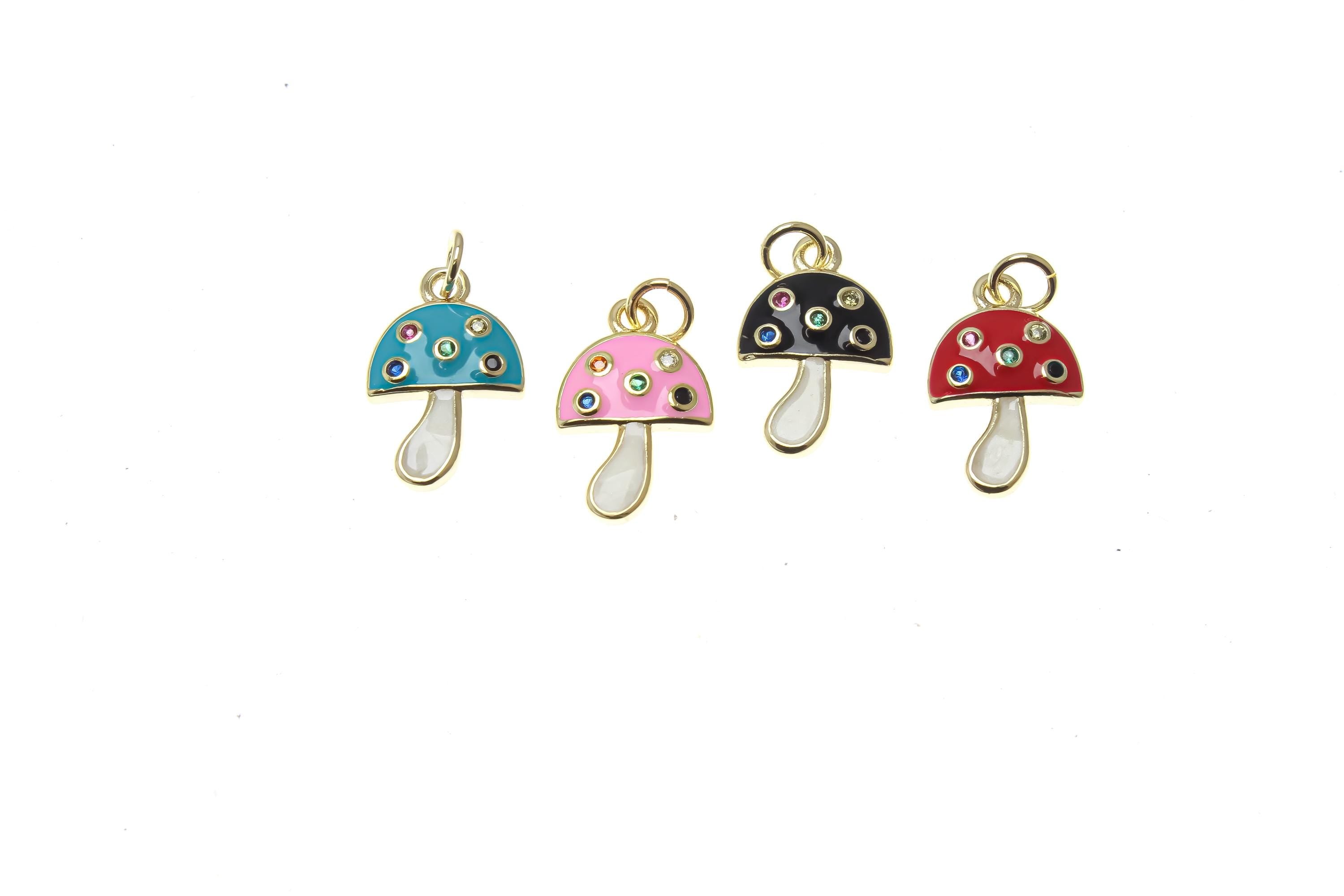 18k Gold Tiny Mushroom Gold Charm, Colorful Micro Pave CZ Stones Enamel Mushroom Pendant, Blue, Pink, Black, or Red, CPG1405