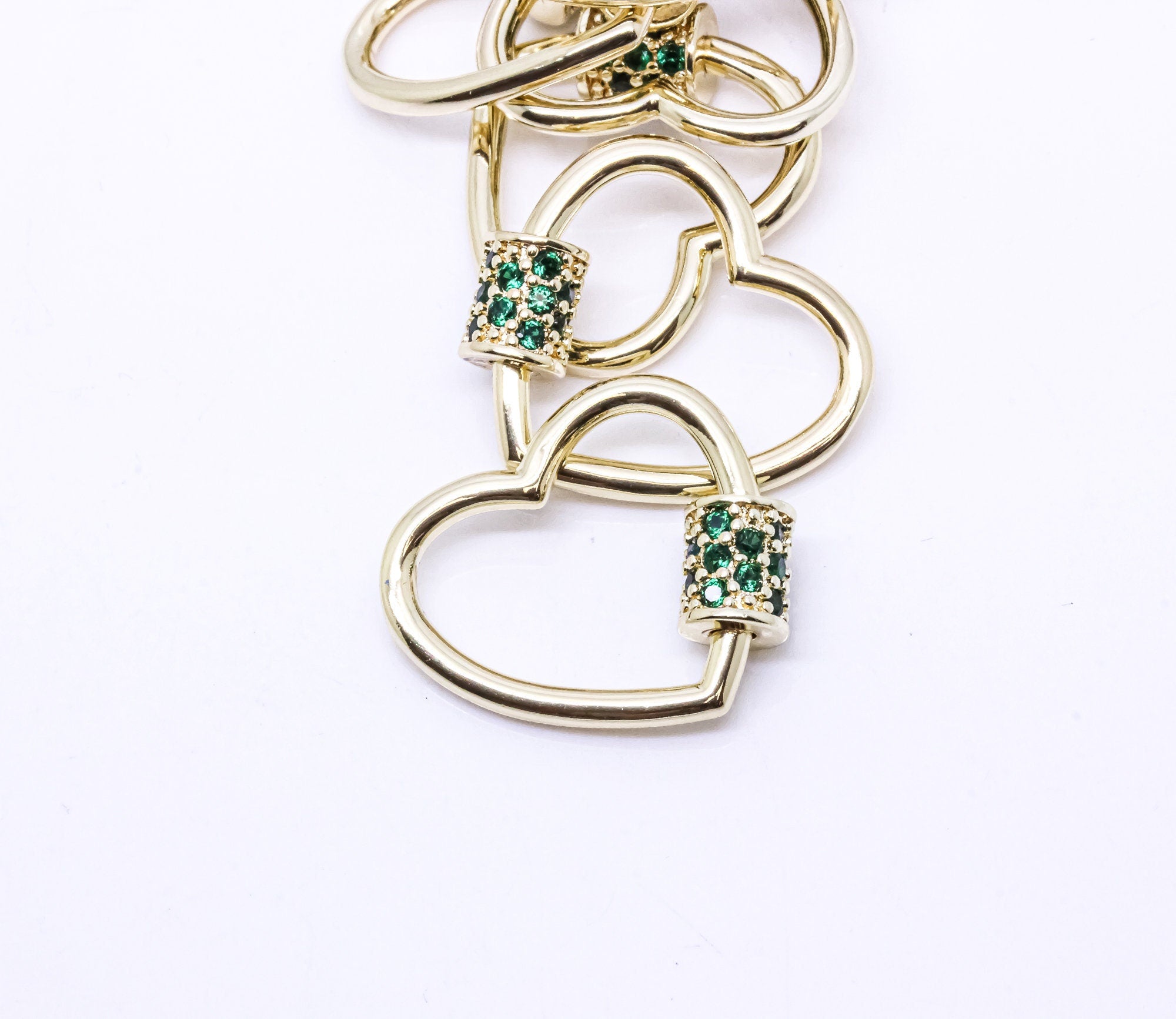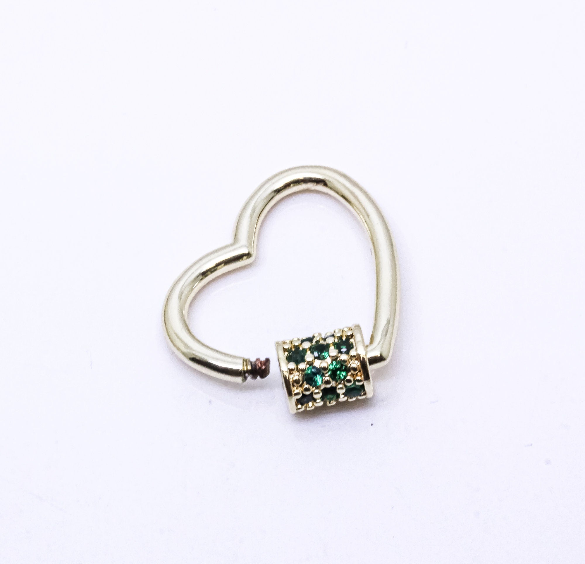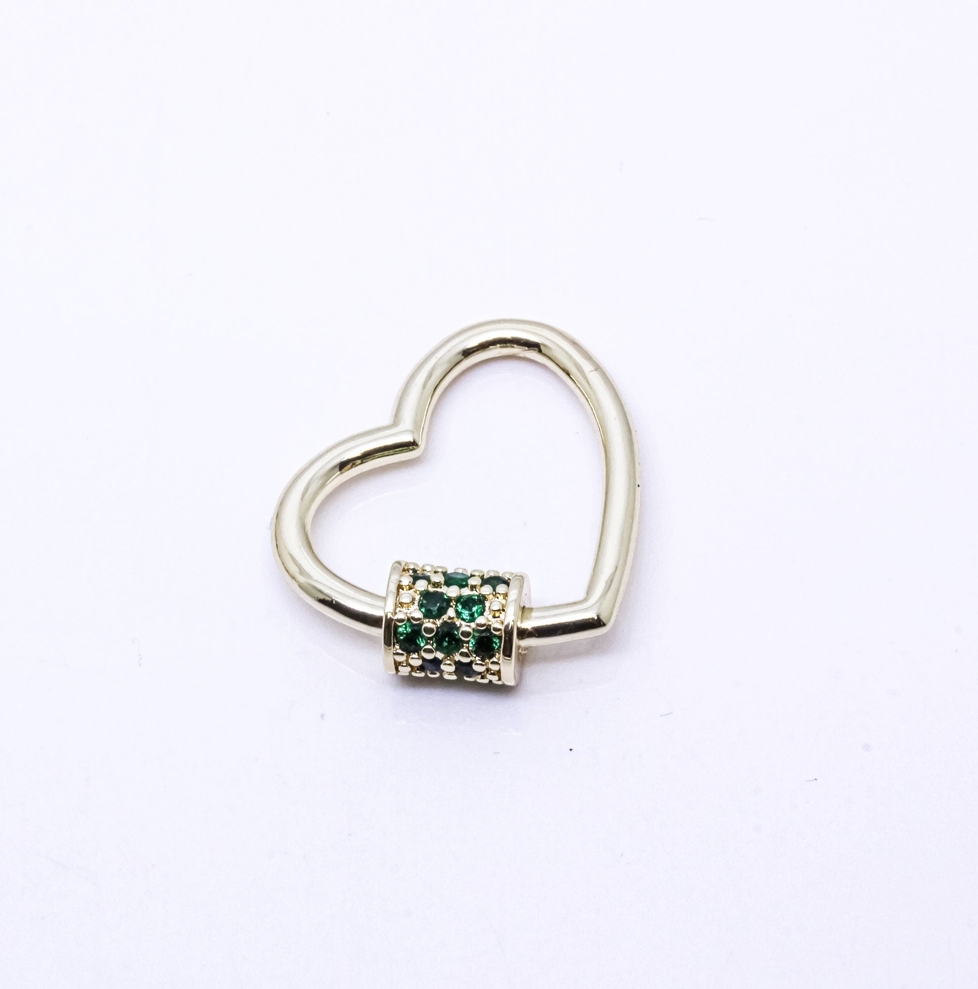 Gold Emerald Green cz Heart Carabiner Lock, 20mm, Screw on clasp, Open Heart Lock