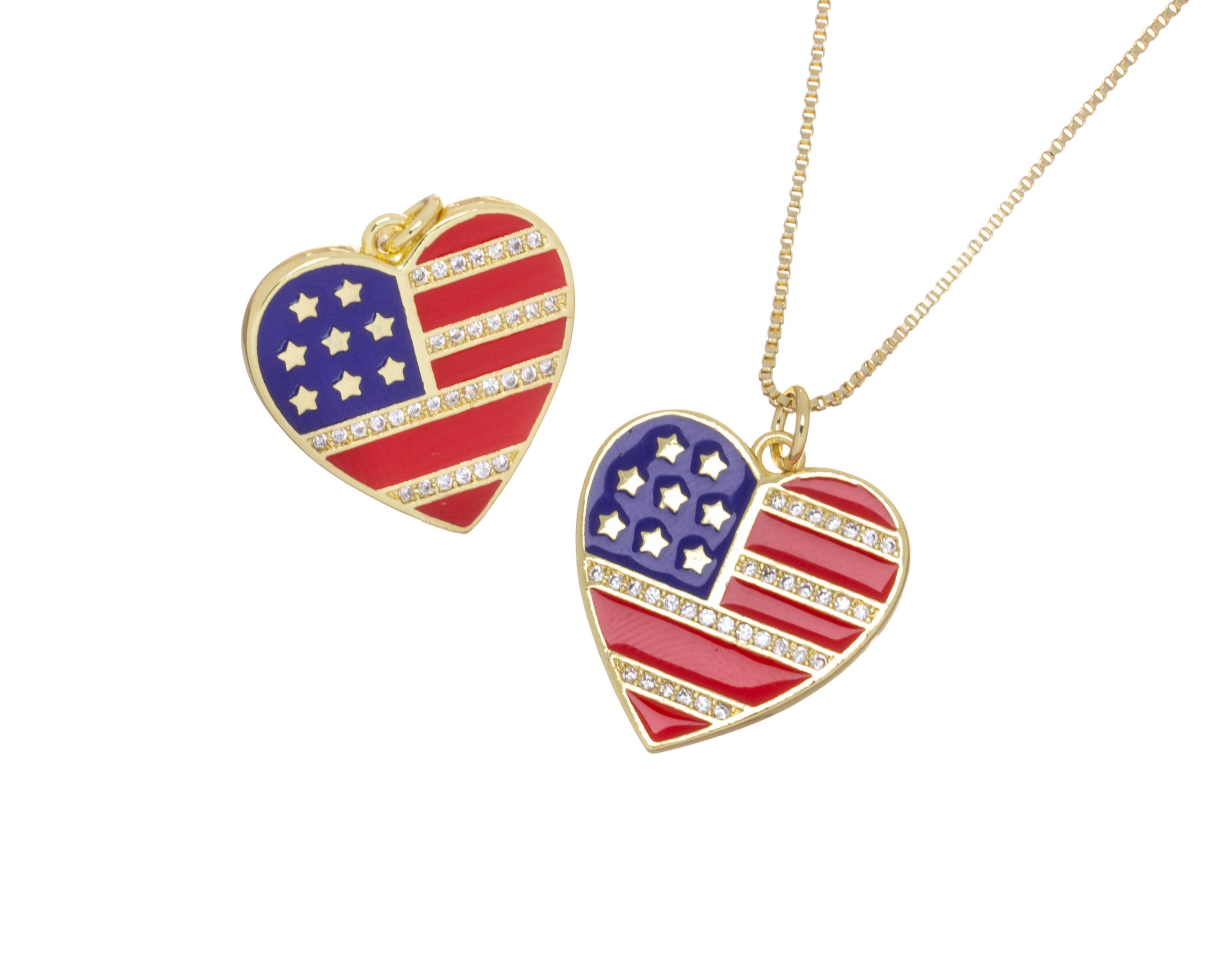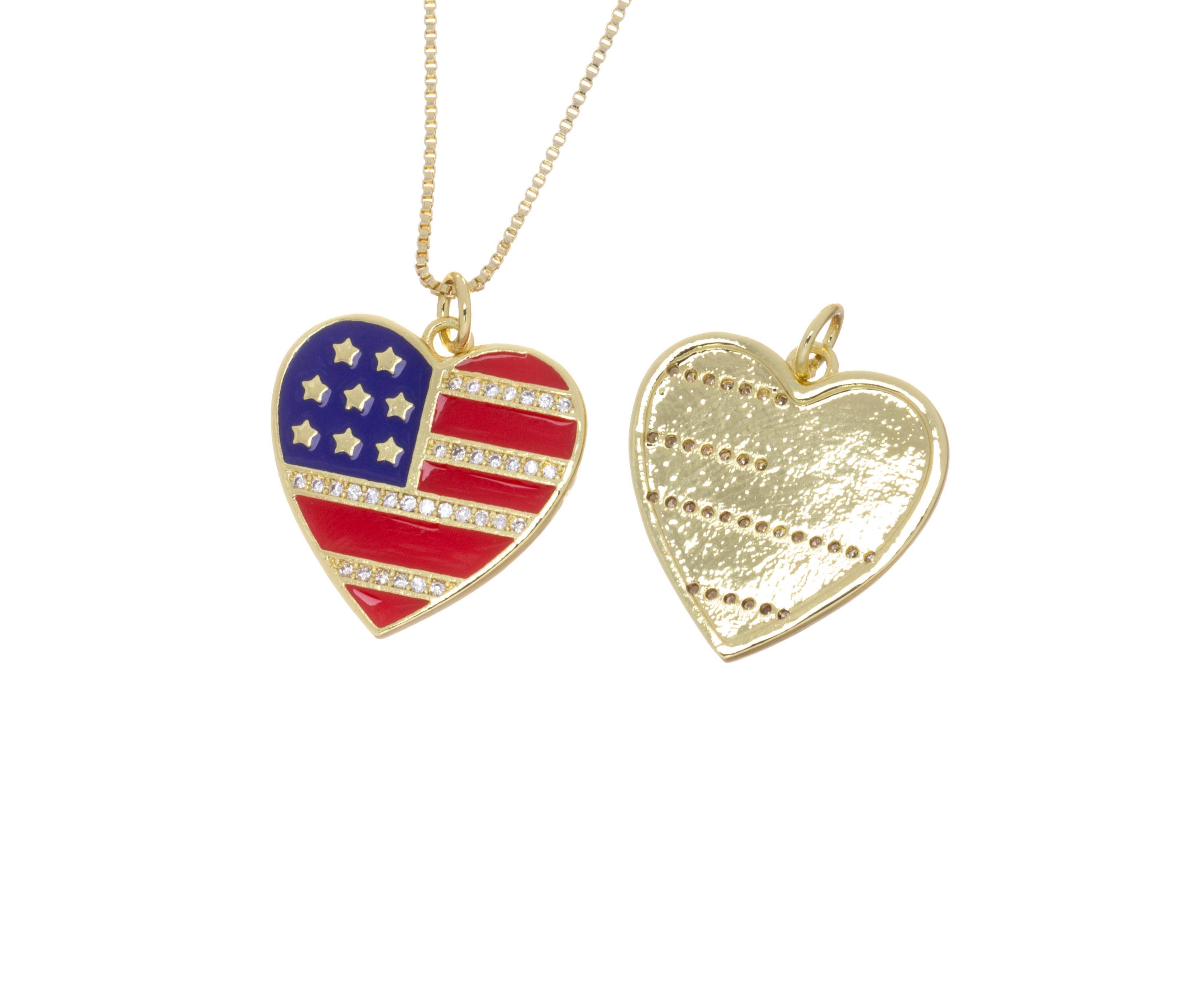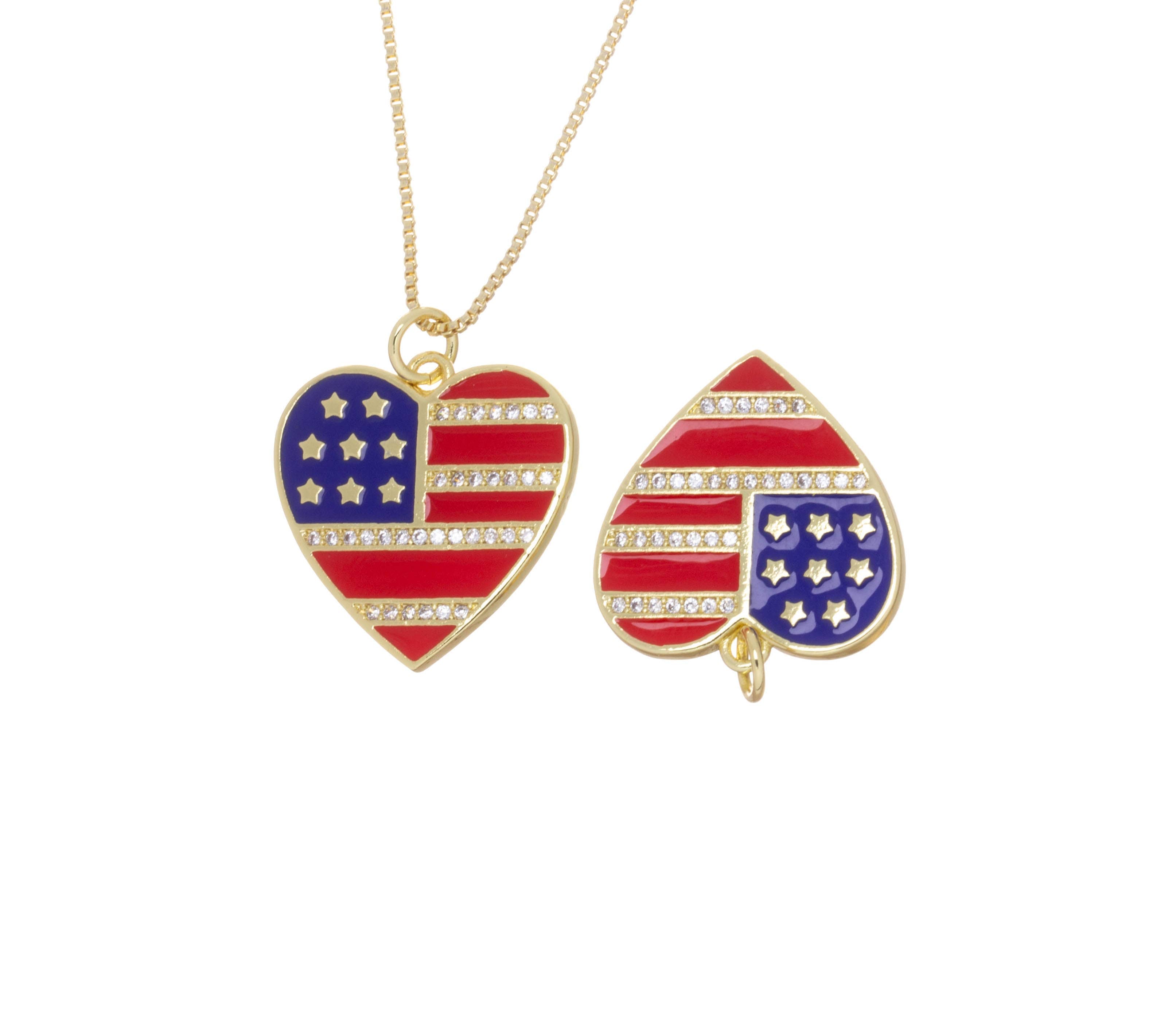 Gold Heart USA American Flag Charm For Necklace Or Earrings Making ,High Polished Shiny Finished, Red White And Blue Enamel,CPG2736