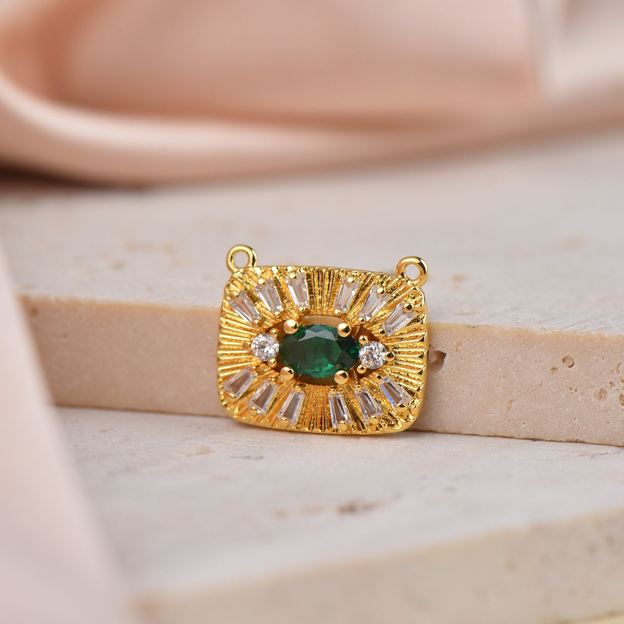 Gold Rectangle Connector Charm With Baguettes And Emerald Green CZ In The Middle,CNG064
