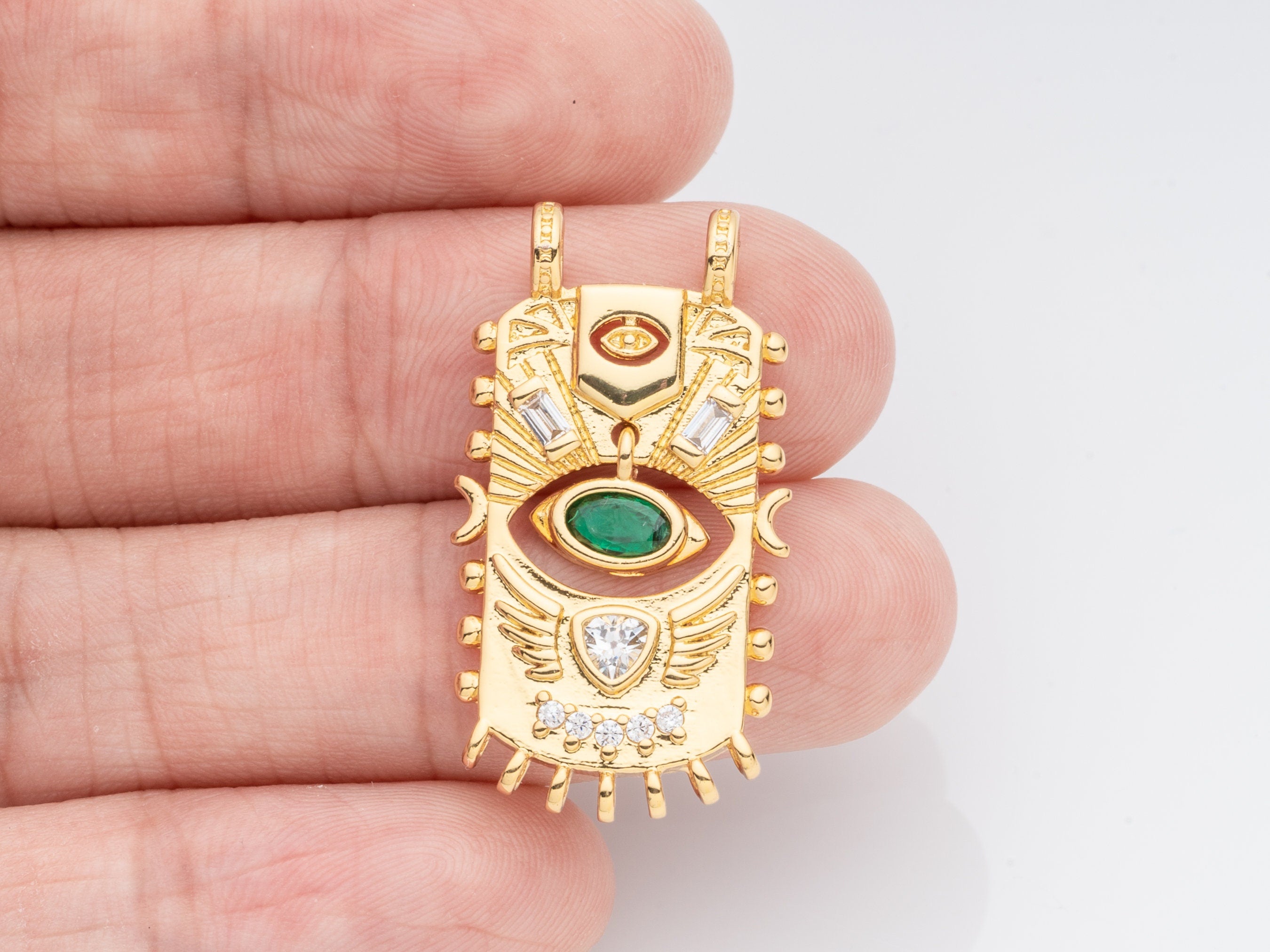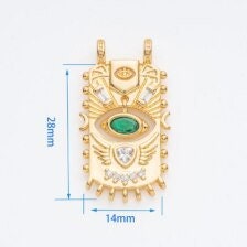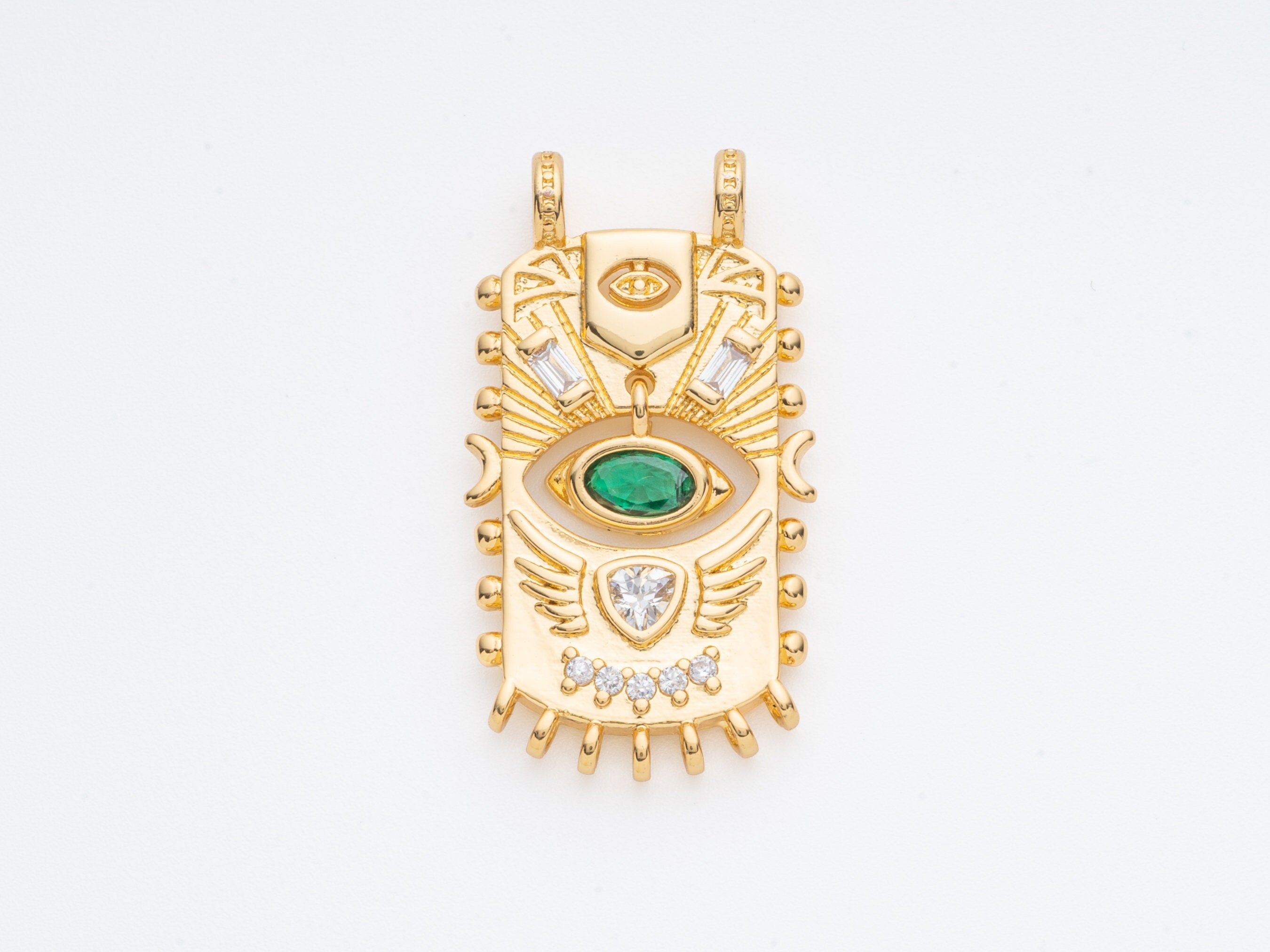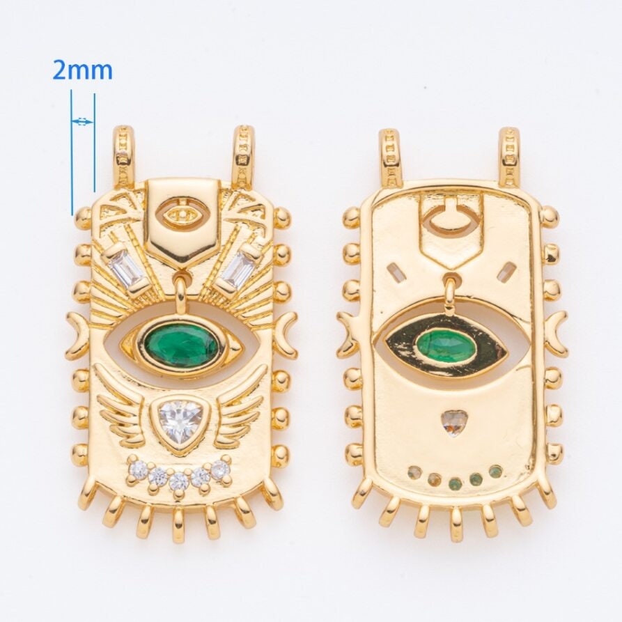 Gold rectangle Evil Eye Pendant, Dangling eye, 2 holes pendant, eye protection cz charm, green cz eye pendant, 28x14mm, CNG013