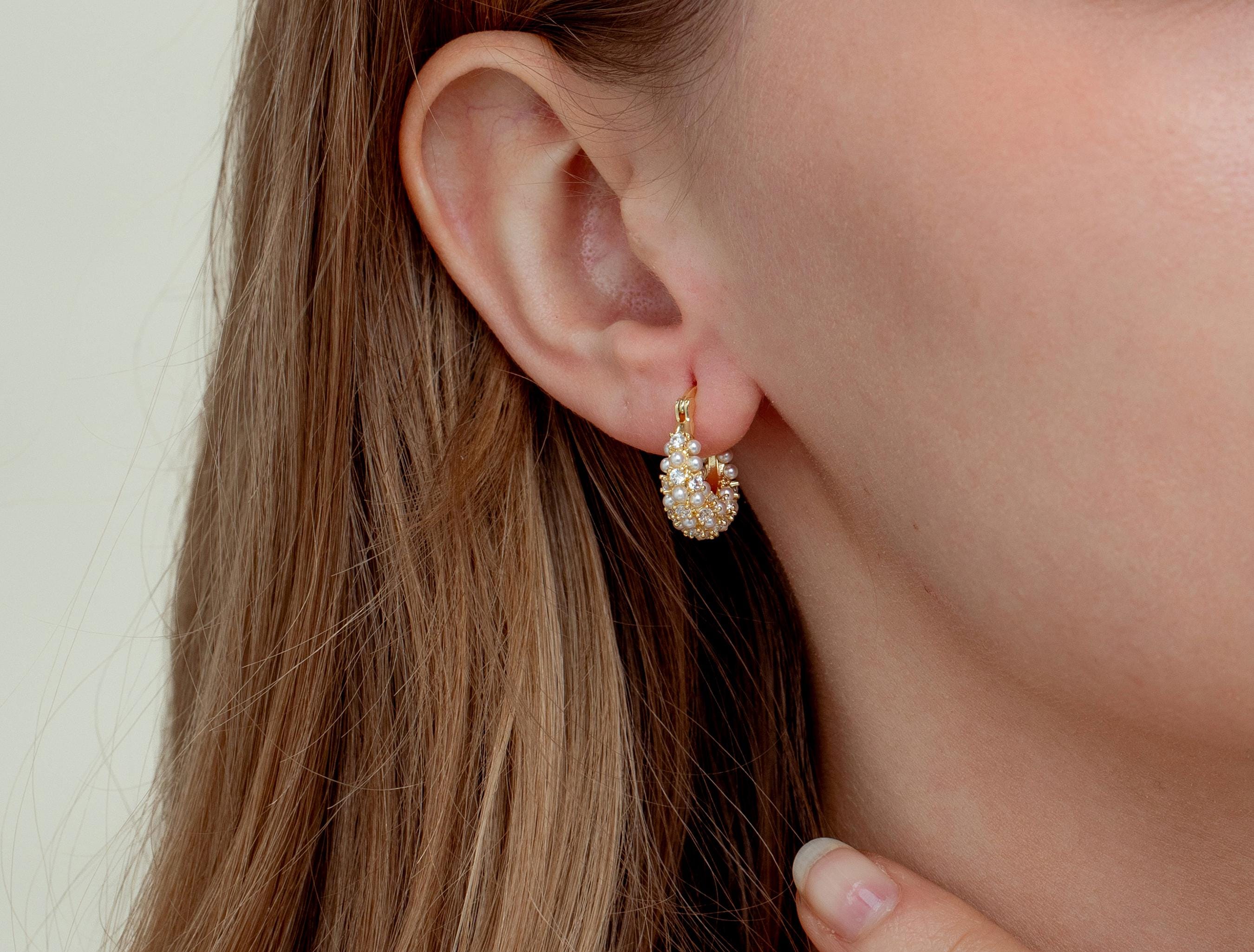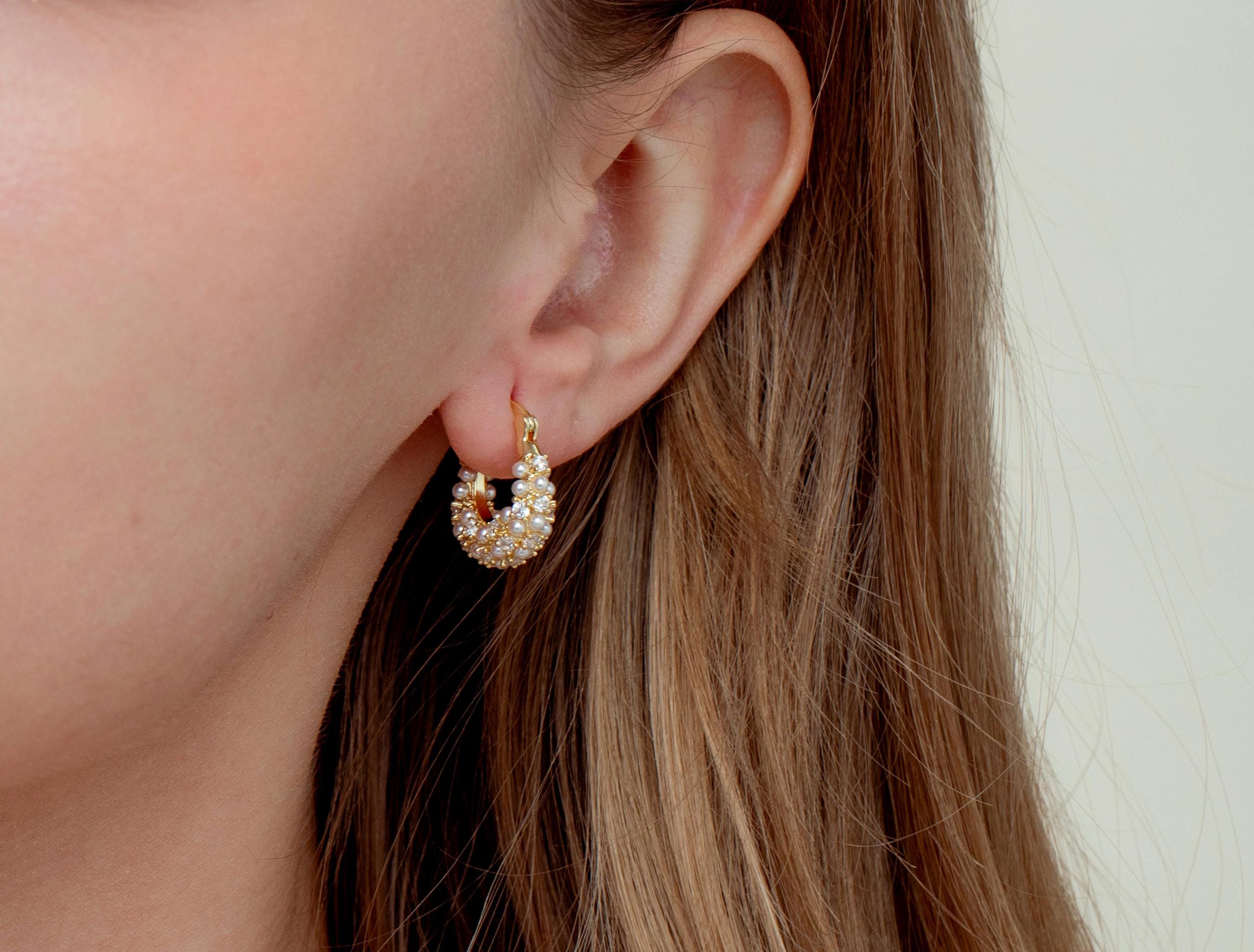 Small Hoop Earrings, CZ and Pearl hoops, CZ details on outside ring, Gold earrings, Pearl Earings, Gifts For Her, Bridal jewelry, ERG382