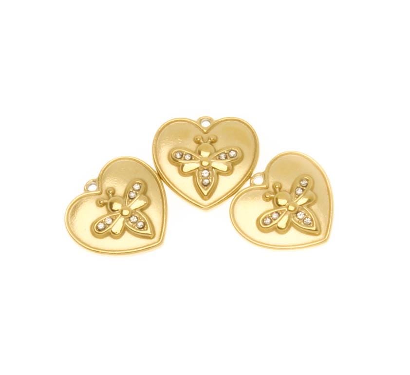 Water Proof, Tarnish Proof Gold CZ Bee Charm, Stainless Steel Heart Charm, Little Bee Detail, Perfect for Necklace, SSPG011